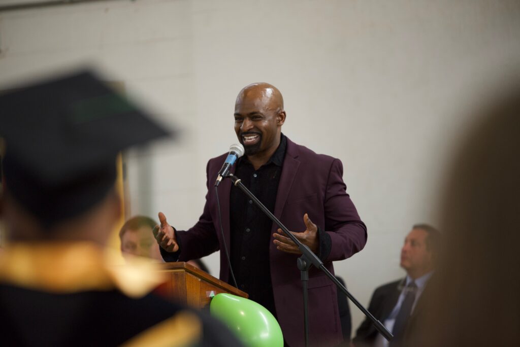 Bain’s speech was in honor of the graduating students and two of his teachers, Eddie Ellis and Harry Belafonte, both leaders in the prison reform movement. Ellis, who served 25 years in the New York State Department of Corrections, including Green Haven Correctional Facility, was a pioneer and a champion in advancing the personhood of currently and formerly incarcerated people. Bain’s speech was also dedicated to his former executive producer, the renowned singer, actor, and activist Harry Belafonte, who passed away just two weeks prior to the graduation. Belafonte was a longtime and ardent supporter of Hudson Link. Bain reminded the crowd that Belafonte’s legacy will be carried on, sharing Belafonte’s own words, “My teachers were W.E.B. Dubois and Paul Robeson. Their teachers were Harriet Tubman and Frederick Douglass. So, what I share with you is in that line, in that tradition.”
